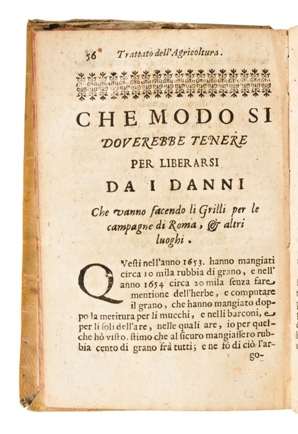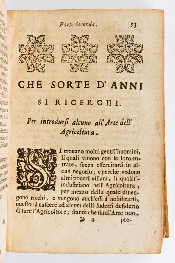 Rare treatise on economics and agriculture printed in Viterbo and dedicated to Francesco Venturi of Orbetello with a noble coat of arms engraved on the frontispiece. In-8ยฐ contemporary binding in full parchment with calligraphic titles on the spine,
