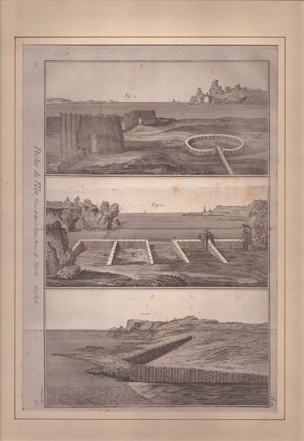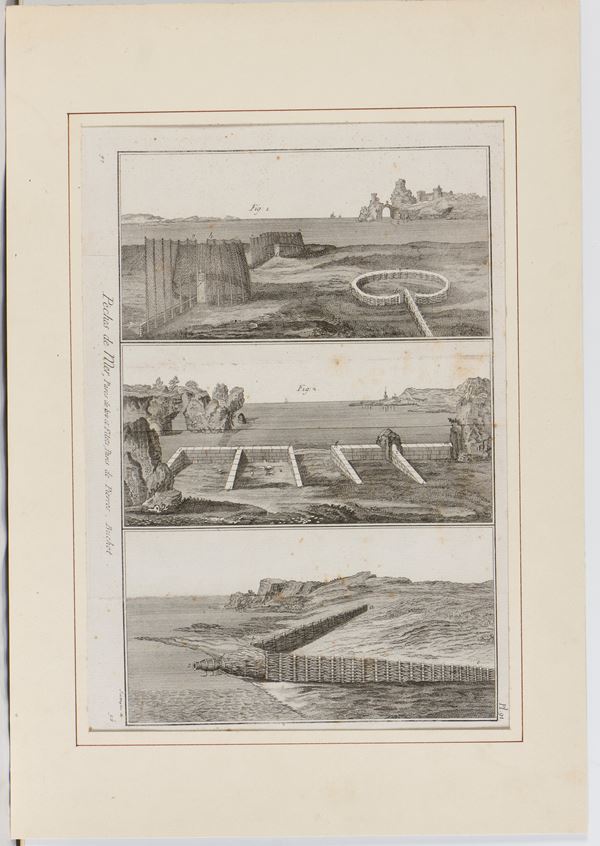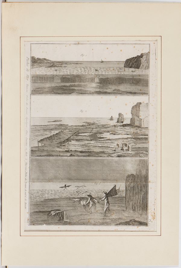 1) Pietro Scattaglia (1739 ca.-1810) PÊCHES DE MER. Due tavole tratte da Dictionnaire de toutes les especes de peches. Bulino, 440 x 305 mm ca. (cad. foglio). Buone condizioni generali salvo fioriture. Con passe-partout.