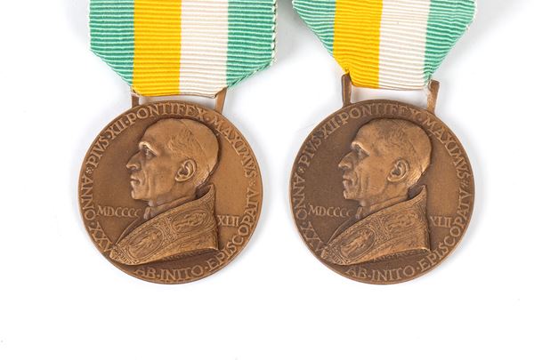 Lotto di due medaglie di benemerenza istituite per celebrare i 25 anni dall'inizio dell'episcopato di Sua Santità Papa Pio XII, bronzo, nastro originale, conservate in astuccio, in ottimo stato