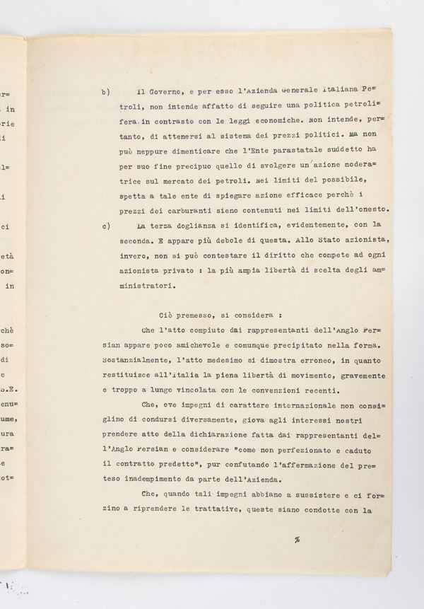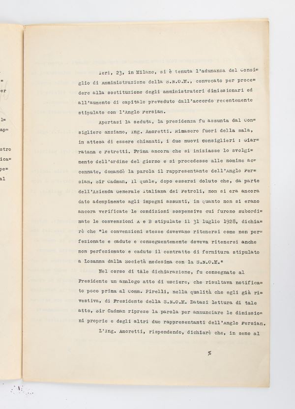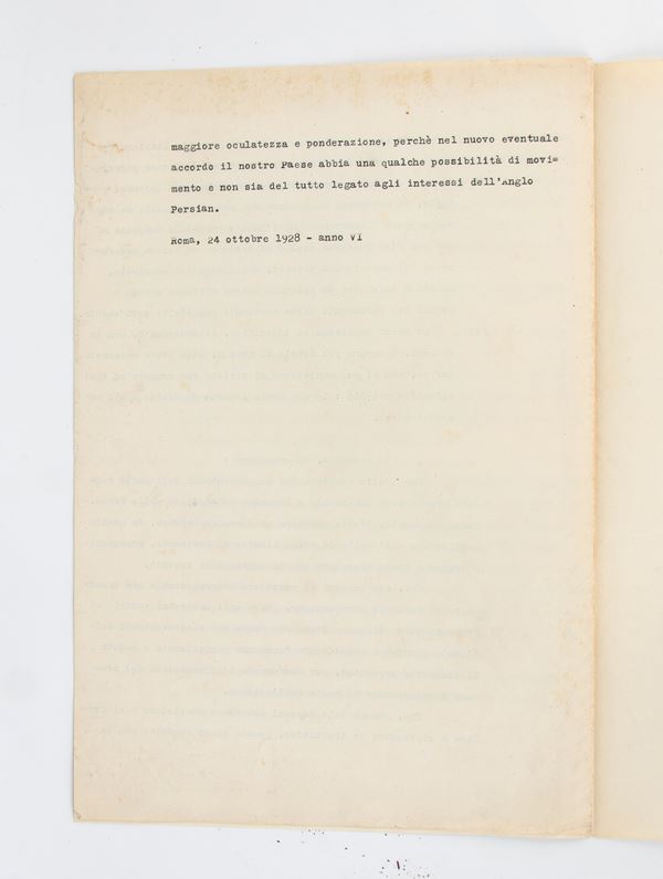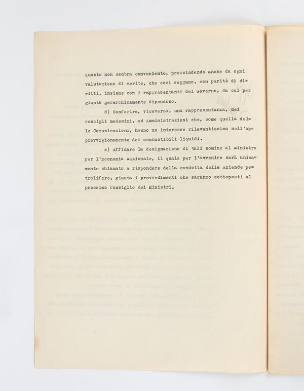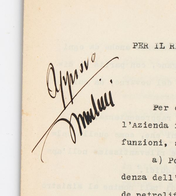 Typewritten document of 2 sheets (6 pages) entitled PER IL RIASSETTO DELL'AZIENDA GENERALE ITALIANA PETROLI, with black ink annotation, handwritten APPROVO and signed MUSSOLINI, top left on the first page. Extraordinary program document for the reorganization of what was the most important Italian oil company (which will later be AGIP), dated 24 OCTOBER 1928- YEAR VI. Sheet size approximately 23x31 cm, in excellent condition.