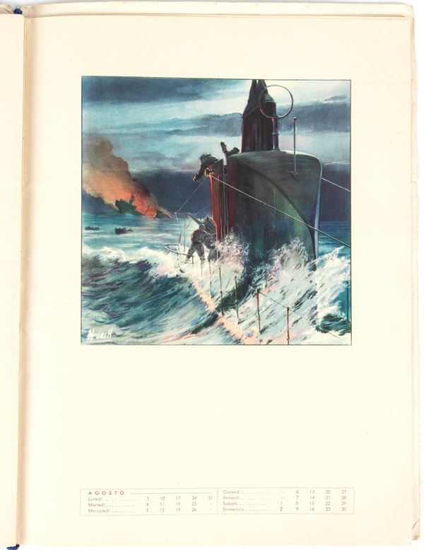 Very rare Atlantica base calendar from Bordeaux composed of 12 plates depicting scenes of naval warfare. Frontispiece with Atlantic submariner's badge in relief and the words "Italian forces in the Atlantic". Good state of preservation. Copy number 395.