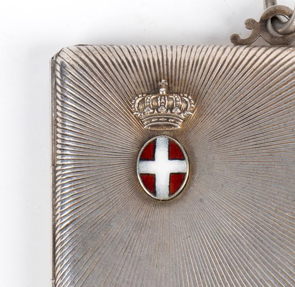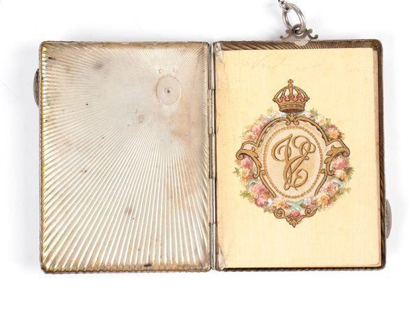 Silver-plated metal with Savoy shield in polychrome enamels, ring with love knot and chain to support small pencil in case, inside there is the order of the dances of the Court ball of February 1910 with notes. Very beautiful, in excellent condition.
