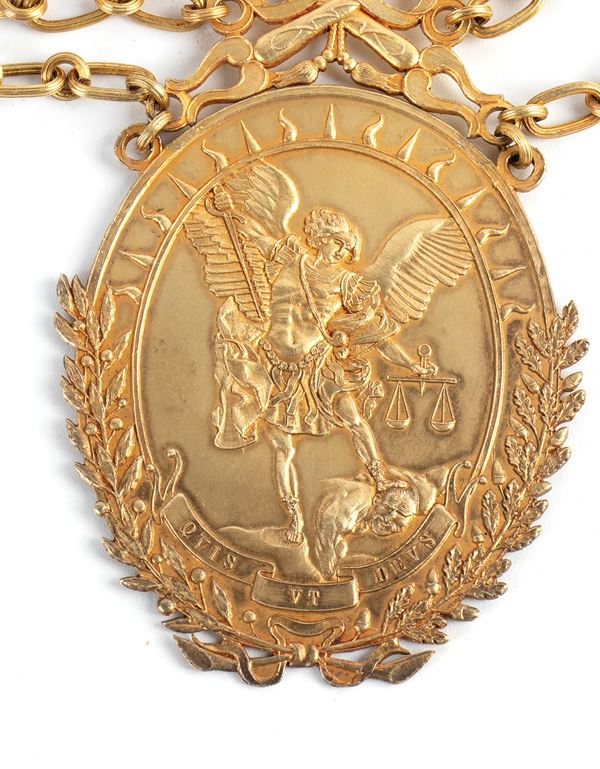 Collar for lawyer of the Roman Rota tribunal (SACRA ROTA), members of the Ecclesiastical Judicial Forum, in gilded metal, with central medallion surmounted by papal Tiara and crossed keys, with the Archangel Gabriel judge in relief, surrounded by oak and laurel wreaths and sun rays, scroll with motto "QUIS UT DEUS", on the back engraved with the initials of the honoree. Necklace interspersed with 3 plaques for each arm with motto "QUIS UT DEUS" - Measurements of the medallion approximately 12x6 cm, length of each arm of the necklace approximately 25 cm