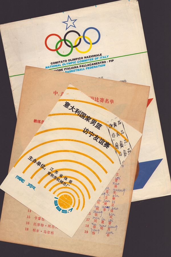 Rigid folder in light blue imitation leather, the official CONI colour, with a presentation brochure of the Italian national basketball team (coach Bianchini, players Lorenzon, Minto, Morandotti, Ricci, Sbaragli, Carera, etc etc) and the Chinese national team, documents relating to the 1985 National Basketball Team for the Tour in the People's Republic of China and Hong Kong, with 6 hand-written statistical tables in blue ink for the players participating in the matches Italy-Hong Kong, Italy-Shanghai, Italy-China, etc headed ASSOCIAZIONE GIORNALISTI ITALIANI BASKET, and other typewritten and hand-written sheets for the journalistic articles to be published in the Corriere, Tempo and GR2. Lot from a CONI accredited journalist. In good condition, folder measures approximately 23x33 cm