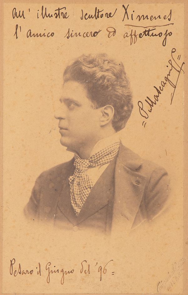 B/w photo applied on cardboard, by Pietro Mascagni, with dedication and autograph signature in black ink.