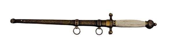 Brass fittings and scabbard decorated with anchors and racemes, grip with pommel decorated with roses and cross guard with lion heads, polished steel blade without tip and edge, in excellent condition.
