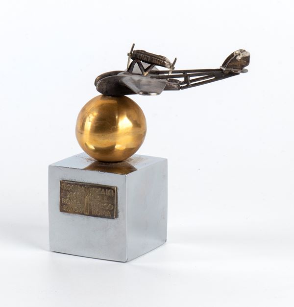 Original Johnson gadget for the tenth anniversary air cruise. Savoia Marchetti SM55x seaplane with rotating propellers, on a golden sphere in boxed sheet metal, resting on a heavy, chrome-plated metal cube, bearing the plate AIR CRUISE OF THE DECENNIAL ROME CHICAGO NEW YORK ROME. In excellent condition, original from 1933. Measures approximately 10x16 cm.