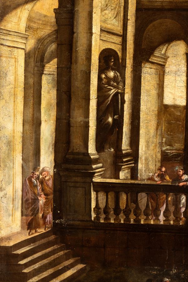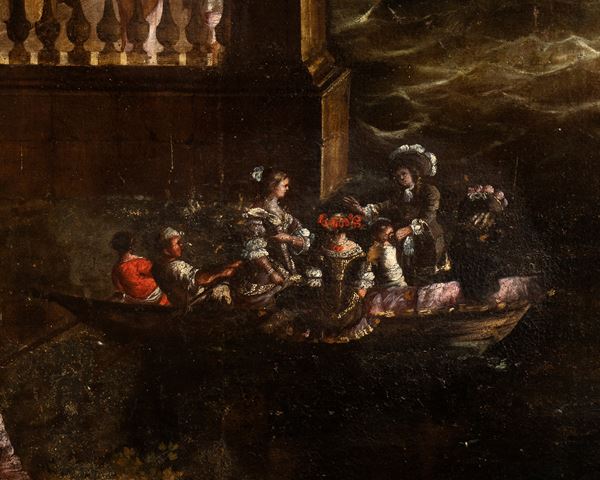Architectural capriccio with figures and boats