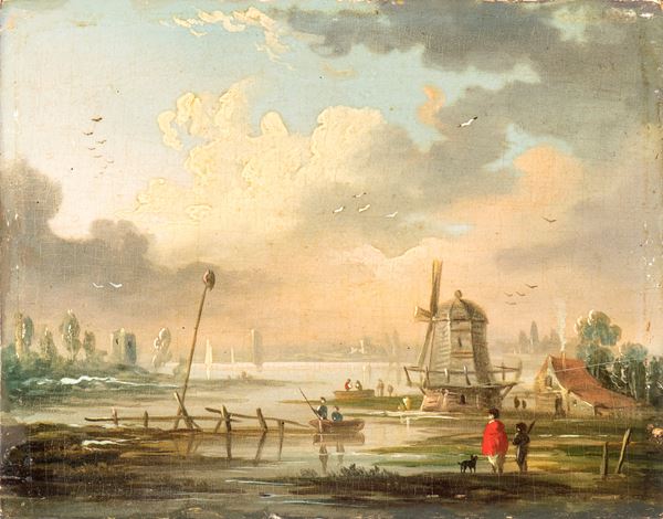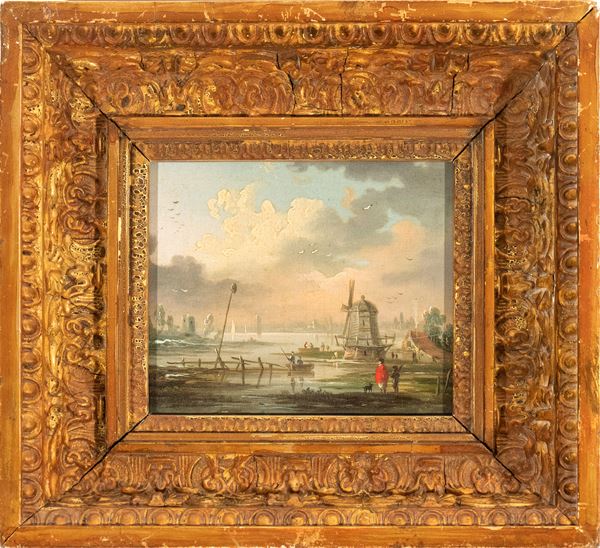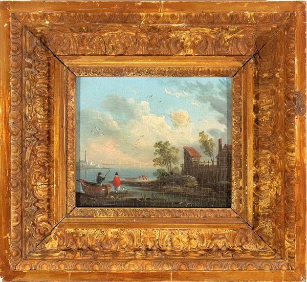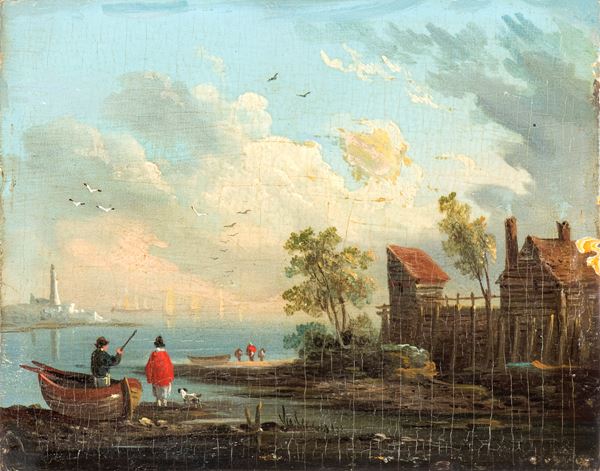 a) Coastal landscape with figures, house and lighthouse in the background; b) Coastal landscape with figures and windmill. Pair of paintings