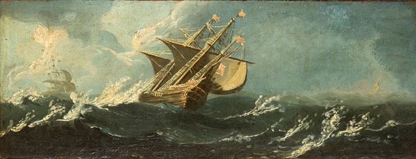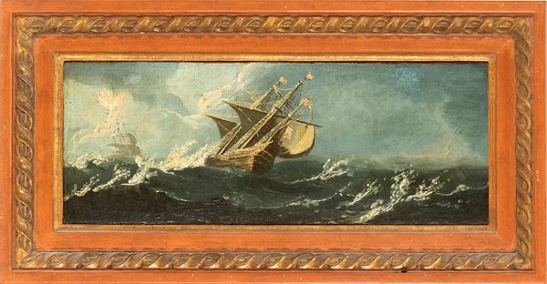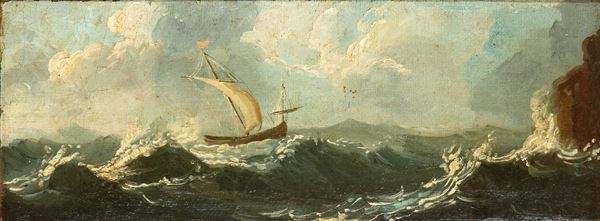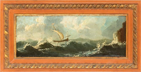 a) Sea storm with sailing ship; b) Stormy sea with boat. Pair of paintings