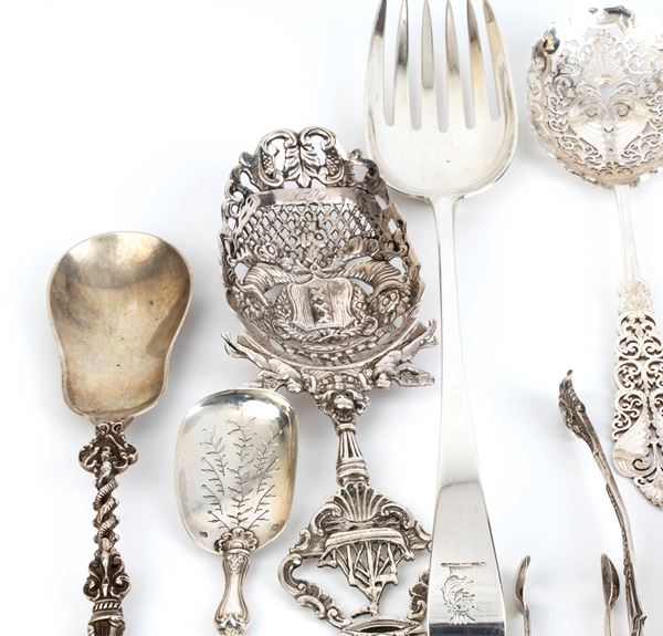 12) openwork spoon with floral and geometric motifs and family crest: unidentifiable German marks.