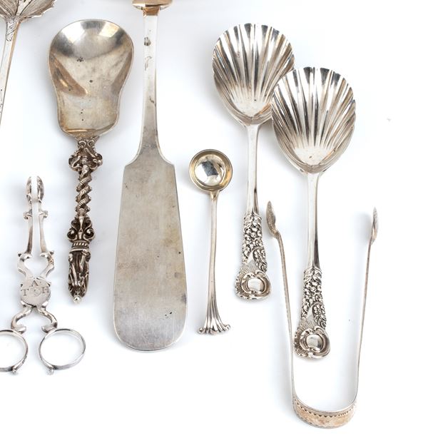 8) scissors with spoons: London hallmark only, silversmith unidentifiable.