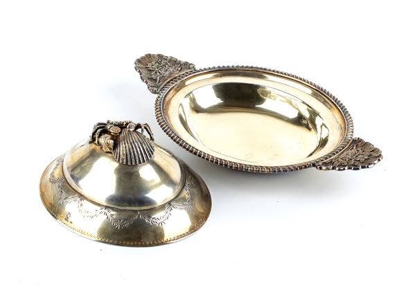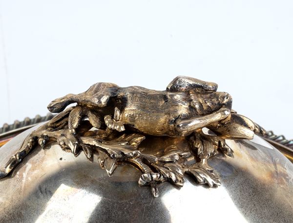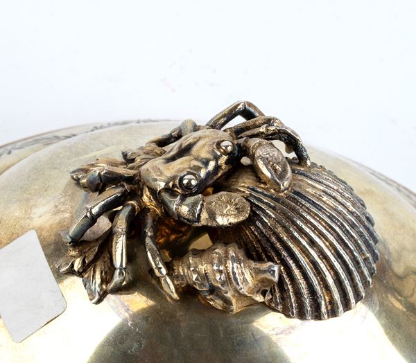of oval shape in vermeille silver with side handles decorated with floral motives and the lid grips respectively modelled as fruit, a crab with a shell, and a rabbit lying on its back.