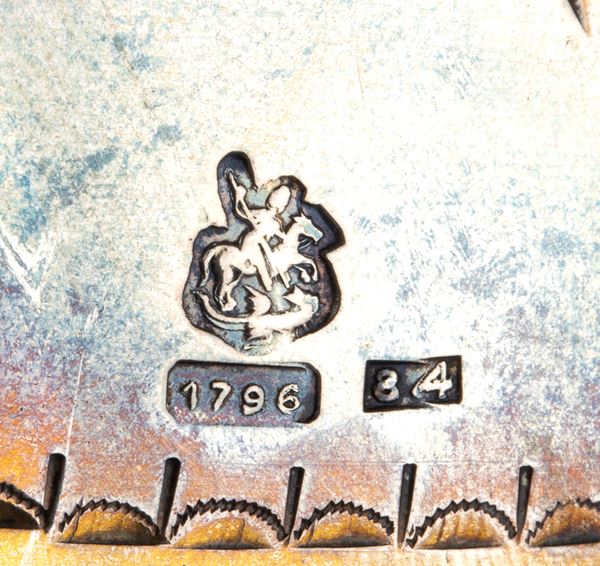 875/1000 silver, hallmarked for a silver fineness of 84 zolotniks (875/1000) used in Moscow in 1796 (possibly counterfeit).