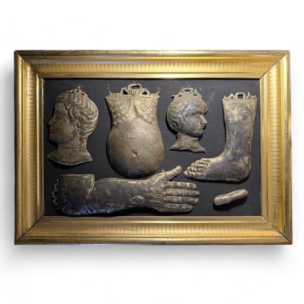a form of popular art, represent testimonies of devotion and religiosity often linked to miraculous events or requests for miracles. The themes represented are categories of vows such as healings, accidents and natural disasters and their patrons range across social classes. The batch in question consists of 6 ex-votos depicting the category of anatomical votive tablets: an arm, a leg, two heads, a finger and a torso.