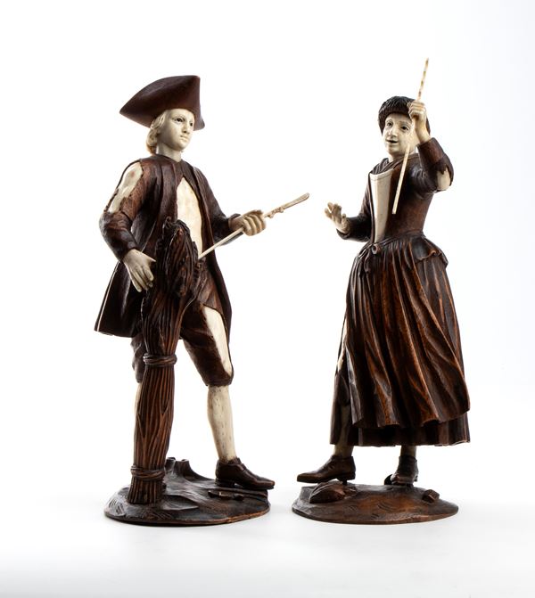made of limewood and bone, these sculptures are carved in the round to depict figures of peasants.