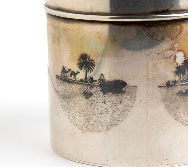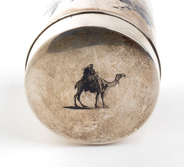 silver, circular in shape with depictions of landscapes.sThe lid features a depiction of a camel.