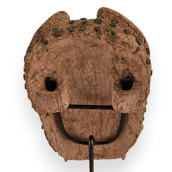 The surface of the leopard’s face, covered with small copper rosettes to represent leopard spots, the slanted eyes bordered in copper, whiskers depicted as a pair of “tridents” on either side of the nose, and leaf-shaped ears are characteristic elements of Edo leopard sculptures. Two suspension rings are present on the back.