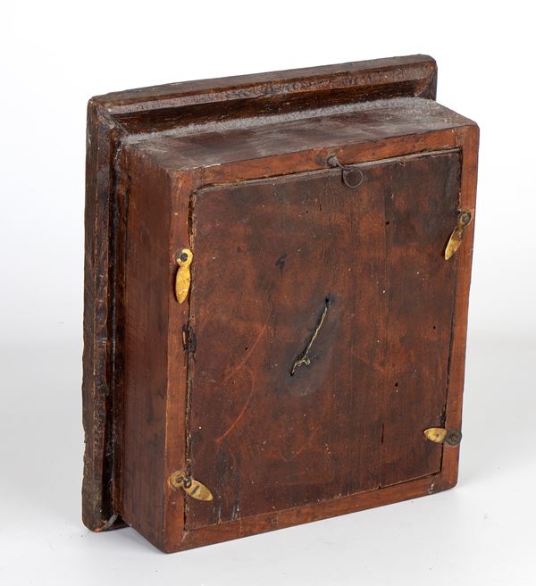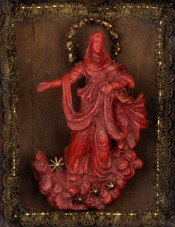 The artwork, made of red Mediterranean coral (Corallium Rubrum), depicts the Madonna in the traditional scene of the Assumption, set within a wooden case with a gilded frame.
