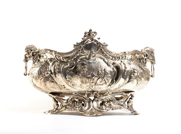 Of shaped form with openwork bases in floral and plant motifs, the body richly decorated with floral elements, garlands, fruit and scrolls; in the centre scenes of daily life and scenes of chivalry. Circle-shaped side handles adorned with ram's heads.