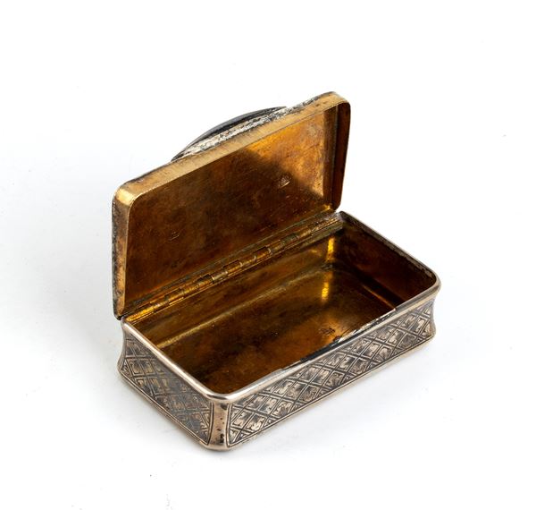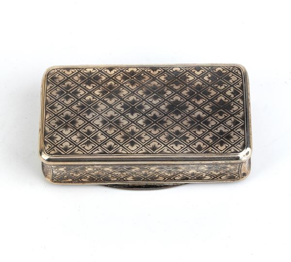 Rectangular in shape with hinged lid and internal gilding, niello-worked with stylised floral motifs; on the front a hunting scene.