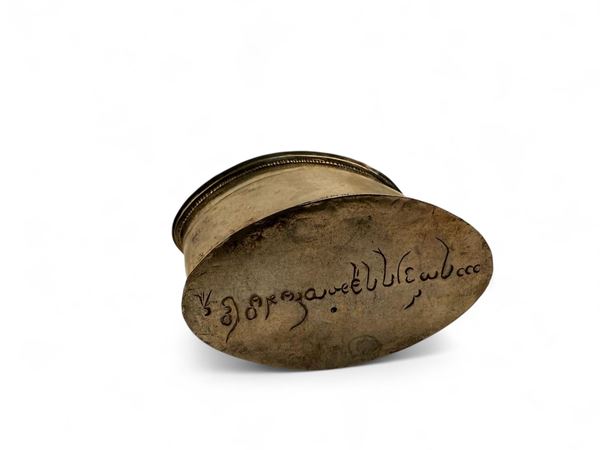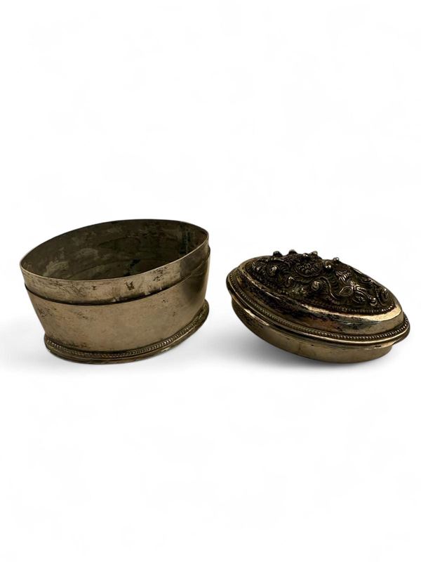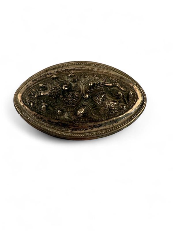 of elliptical shape with a smooth body and push-on lid with rich embossed and chiselled decoration depicting a running dog.