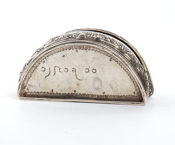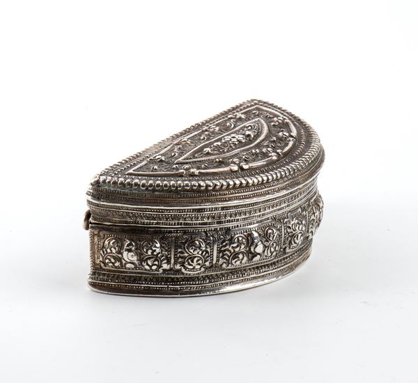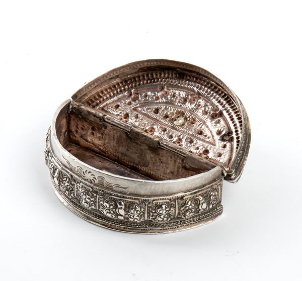 half moon shaped, embossed and chiselled with a rich decoration of repeating foliate and floral volutes, hinged lid.
