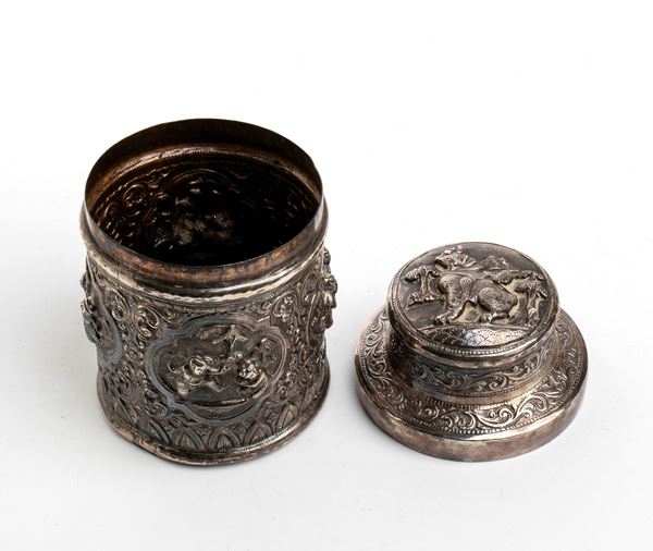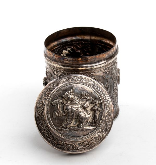 of circular shape with push-on lid, richly embossed and chiselled with traditional Burmese cultural figures.