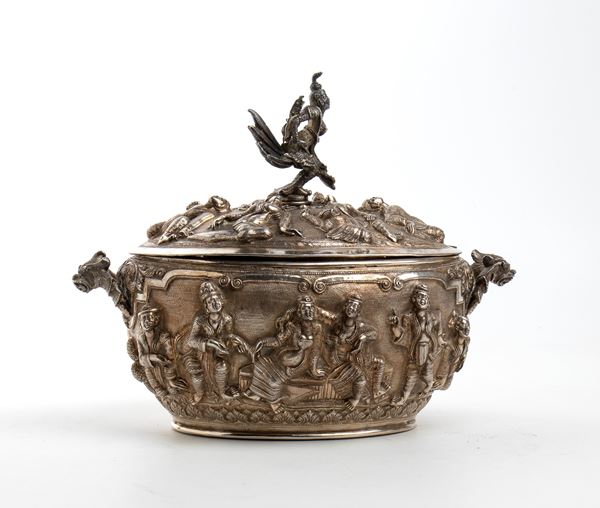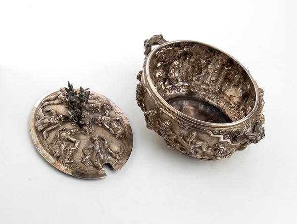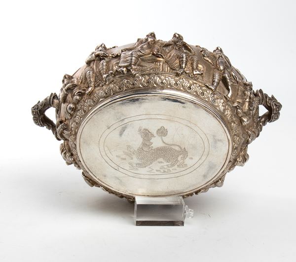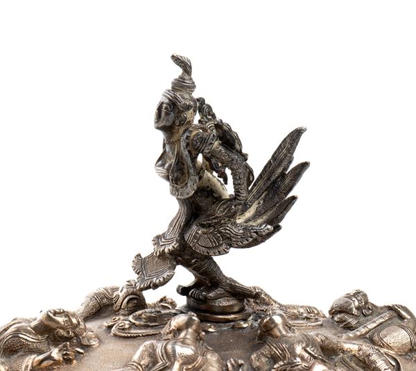 oval in shape, it presents a lid with a plug-in closure topped with a mythological figure from the Burmese tradition, as well as a richly embossed and chiselled body with traditional mythological scenes in relief and finished with numerous decorations.