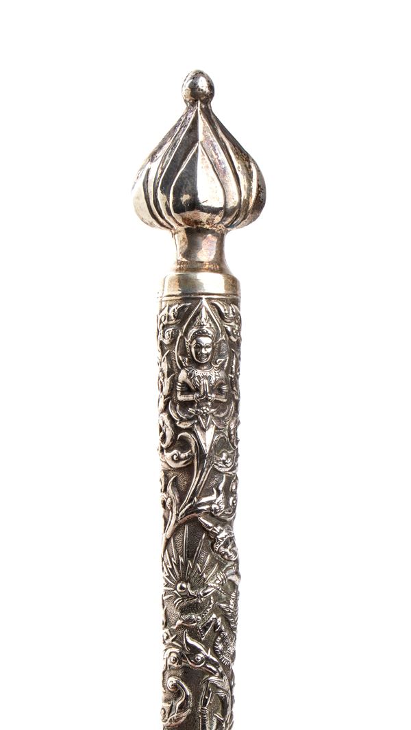 richly decorated with traditional Burmese figures alternating with leafy scrolls.
