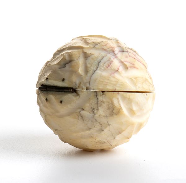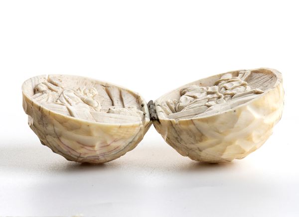 Openable spherical diptychs were essentially manufactured in France and Germany between the 18th and 19th centuries, taking up the tradition of the Prayer nuts. The English term Prayer nut or Prayer beads is derived from equivalent Dutch word gebedsnoot, and took on common usage in the 18th century. The use of the word "nut" may come from the fact that some of the beads were actually carved from nuts or pits, practice in medieval southern Germany. They are typically openable into halves and carved inside of highly detailed and intricate Christian religious scenes or historical Scene. Their size varies between the 2 and 5 cm in diameter, mostly the same shape, decorated on the outside with carved openwork Gothic tracery and flower-heads. They often contain central scenes depicting episodes from the life of Mary or the Passion of Jesus and in some instances, they contain carved inscriptions usually related to the meaning of the narrative.