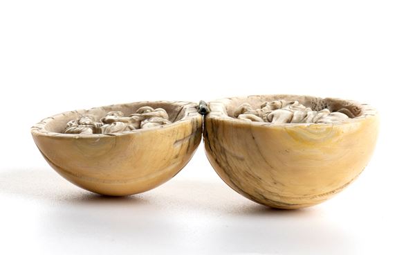 Openable spherical diptychs were essentially manufactured in France and Germany between the 18th and 19th centuries, taking up the tradition of the Prayer nuts. The English term Prayer nut or Prayer beads is derived from equivalent Dutch word gebedsnoot, and took on common usage in the 18th century. The use of the word "nut" may come from the fact that some of the beads were actually carved from nuts or pits, practice in medieval southern Germany. They are typically openable into halves and carved inside of highly detailed and intricate Christian religious scenes or historical Scene. Their size varies between the 2 and 5 cm in diameter, mostly the same shape, decorated on the outside with carved openwork Gothic tracery and flower-heads. They often contain central scenes depicting episodes from the life of Mary or the Passion of Jesus and in some instances, they contain carved inscriptions usually related to the meaning of the narrative.