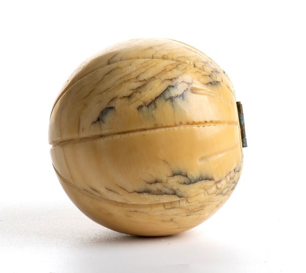 Carved ivory foldable diptych ball, France, Dieppe (?) 19th century