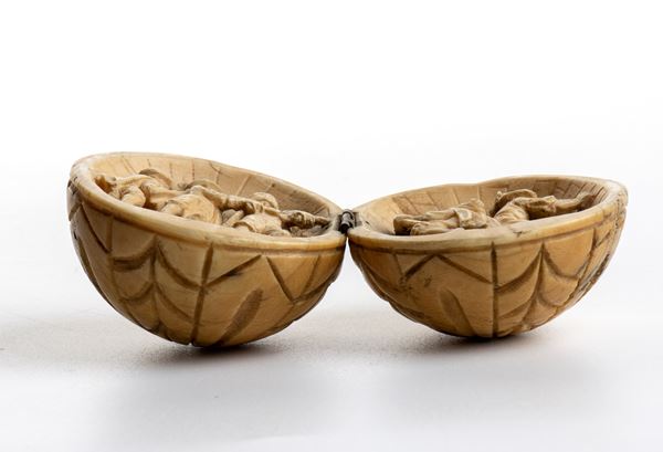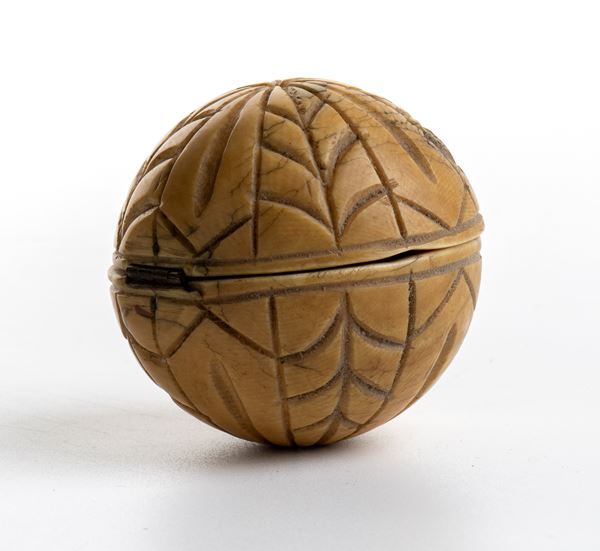 Openable spherical diptychs were essentially manufactured in France and Germany between the 18th and 19th centuries, taking up the tradition of the Prayer nuts. The English term Prayer nut or Prayer beads is derived from equivalent Dutch word gebedsnoot, and took on common usage in the 18th century. The use of the word "nut" may come from the fact that some of the beads were actually carved from nuts or pits, practice in medieval southern Germany. They are typically openable into halves and carved inside of highly detailed and intricate Christian religious scenes or historical Scene. Their size varies between the 2 and 5 cm in diameter, mostly the same shape, decorated on the outside with carved openwork Gothic tracery and flower-heads. They often contain central scenes depicting episodes from the life of Mary or the Passion of Jesus and in some instances, they contain carved inscriptions usually related to the meaning of the narrative.