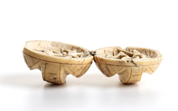 elephant ivory (Elephas maximus Linnaeus, 1758 or Loxodonta africana Blumenbach, 1797). The outside is carved in the round with vertical ribs, the inside depicts a medieval battle.