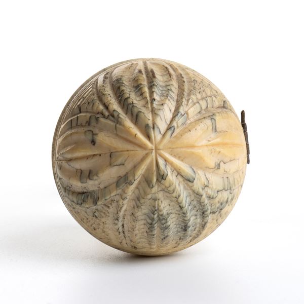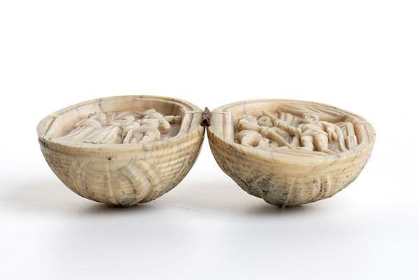 Openable spherical diptychs were essentially manufactured in France and Germany between the 18th and 19th centuries, taking up the tradition of the Prayer nuts. The English term Prayer nut or Prayer beads is derived from equivalent Dutch word gebedsnoot, and took on common usage in the 18th century. The use of the word "nut" may come from the fact that some of the beads were actually carved from nuts or pits, practice in medieval southern Germany. They are typically openable into halves and carved inside of highly detailed and intricate Christian religious scenes or historical Scene. Their size varies between the 2 and 5 cm in diameter, mostly the same shape, decorated on the outside with carved openwork Gothic tracery and flower-heads. They often contain central scenes depicting episodes from the life of Mary or the Passion of Jesus and in some instances, they contain carved inscriptions usually related to the meaning of the narrative.
