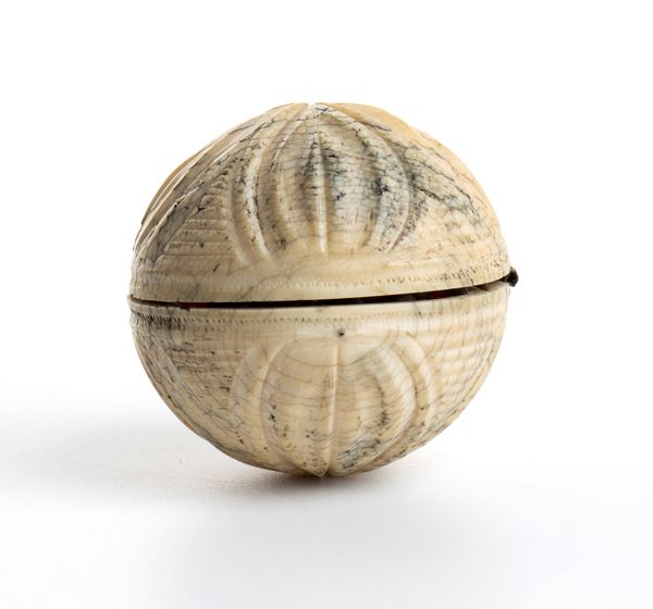 Carved ivory foldable diptych ball, France, Dieppe (?) 19th century