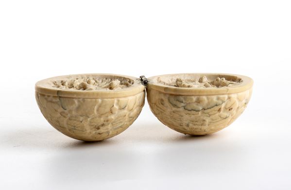 Openable spherical diptychs were essentially manufactured in France and Germany between the 18th and 19th centuries, taking up the tradition of the Prayer nuts. The English term Prayer nut or Prayer beads is derived from equivalent Dutch word gebedsnoot, and took on common usage in the 18th century. The use of the word "nut" may come from the fact that some of the beads were actually carved from nuts or pits, practice in medieval southern Germany. They are typically openable into halves and carved inside of highly detailed and intricate Christian religious scenes or historical Scene. Their size varies between the 2 and 5 cm in diameter, mostly the same shape, decorated on the outside with carved openwork Gothic tracery and flower-heads. They often contain central scenes depicting episodes from the life of Mary or the Passion of Jesus and in some instances, they contain carved inscriptions usually related to the meaning of the narrative.