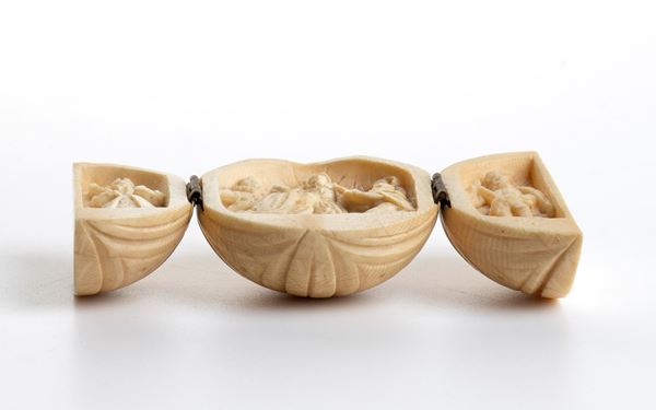 Openable spherical diptychs were essentially manufactured in France and Germany between the 18th and 19th centuries, taking up the tradition of the Prayer nuts. The English term Prayer nut or Prayer beads is derived from equivalent Dutch word gebedsnoot, and took on common usage in the 18th century. The use of the word "nut" may come from the fact that some of the beads were actually carved from nuts or pits, practice in medieval southern Germany. They are typically openable into halves and carved inside of highly detailed and intricate Christian religious scenes or historical Scene. Their size varies between the 2 and 5 cm in diameter, mostly the same shape, decorated on the outside with carved openwork Gothic tracery and flower-heads. They often contain central scenes depicting episodes from the life of Mary or the Passion of Jesus and in some instances, they contain carved inscriptions usually related to the meaning of the narrative.