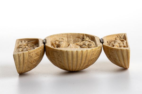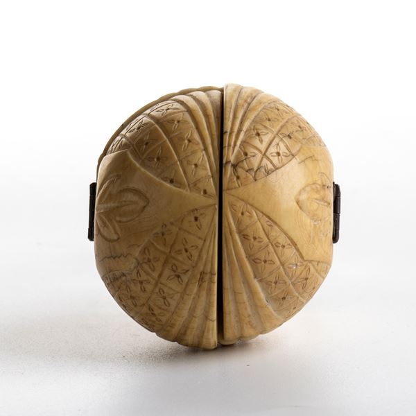 Openable spherical diptychs were essentially manufactured in France and Germany between the 18th and 19th centuries, taking up the tradition of the Prayer nuts. The English term Prayer nut or Prayer beads is derived from equivalent Dutch word gebedsnoot, and took on common usage in the 18th century. The use of the word "nut" may come from the fact that some of the beads were actually carved from nuts or pits, practice in medieval southern Germany. They are typically openable into halves and carved inside of highly detailed and intricate Christian religious scenes or historical Scene. Their size varies between the 2 and 5 cm in diameter, mostly the same shape, decorated on the outside with carved openwork Gothic tracery and flower-heads. They often contain central scenes depicting episodes from the life of Mary or the Passion of Jesus and in some instances, they contain carved inscriptions usually related to the meaning of the narrative.