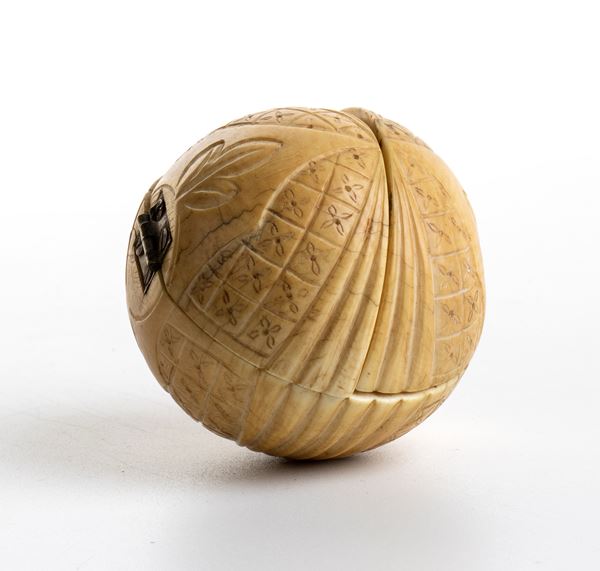 Carved ivory foldable triptych ball, France, Dieppe (?) 19th century