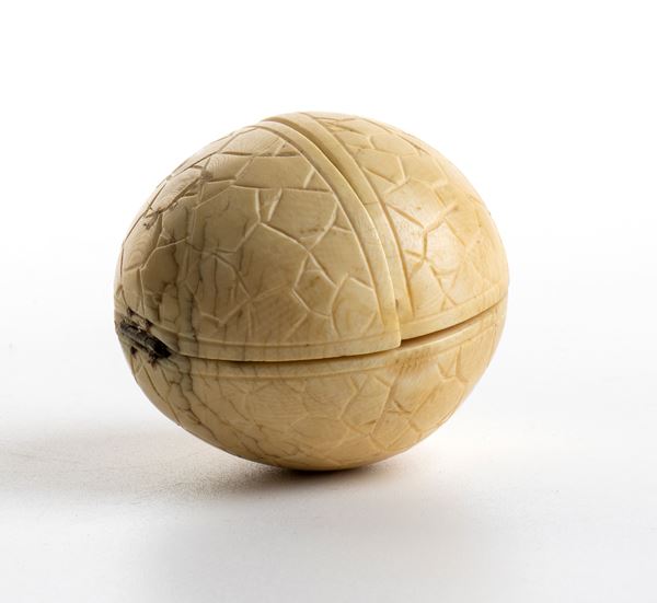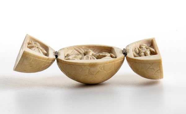 Openable spherical diptychs were essentially manufactured in France and Germany between the 18th and 19th centuries, taking up the tradition of the Prayer nuts. The English term Prayer nut or Prayer beads is derived from equivalent Dutch word gebedsnoot, and took on common usage in the 18th century. The use of the word "nut" may come from the fact that some of the beads were actually carved from nuts or pits, practice in medieval southern Germany. They are typically openable into halves and carved inside of highly detailed and intricate Christian religious scenes or historical Scene. Their size varies between the 2 and 5 cm in diameter, mostly the same shape, decorated on the outside with carved openwork Gothic tracery and flower-heads. They often contain central scenes depicting episodes from the life of Mary or the Passion of Jesus and in some instances, they contain carved inscriptions usually related to the meaning of the narrative.