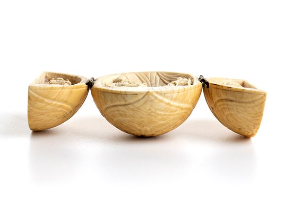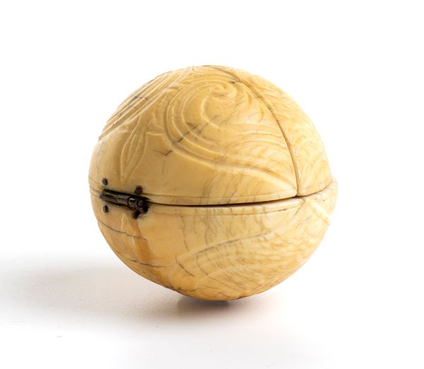 Openable spherical diptychs were essentially manufactured in France and Germany between the 18th and 19th centuries, taking up the tradition of the Prayer nuts. The English term Prayer nut or Prayer beads is derived from equivalent Dutch word gebedsnoot, and took on common usage in the 18th century. The use of the word "nut" may come from the fact that some of the beads were actually carved from nuts or pits, practice in medieval southern Germany. They are typically openable into halves and carved inside of highly detailed and intricate Christian religious scenes or historical Scene. Their size varies between the 2 and 5 cm in diameter, mostly the same shape, decorated on the outside with carved openwork Gothic tracery and flower-heads. They often contain central scenes depicting episodes from the life of Mary or the Passion of Jesus and in some instances, they contain carved inscriptions usually related to the meaning of the narrative.