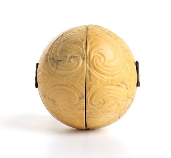Carved ivory foldable triptych ball, France, Dieppe (?) 19th century