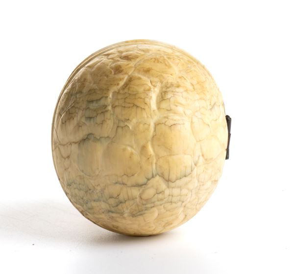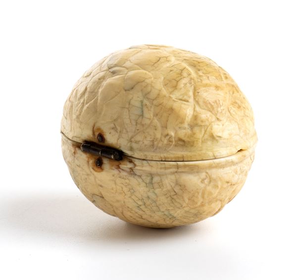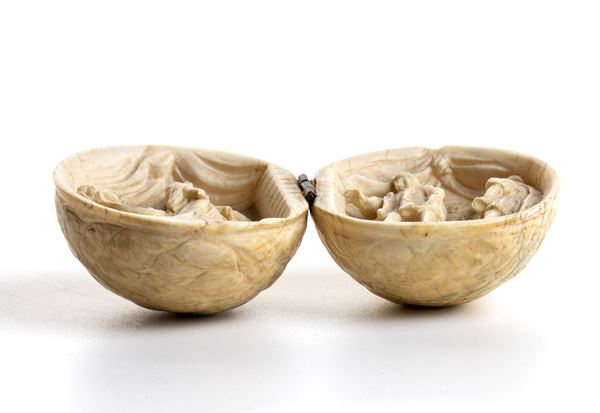 Openable spherical diptychs were essentially manufactured in France and Germany between the 18th and 19th centuries, taking up the tradition of the Prayer nuts. The English term Prayer nut or Prayer beads is derived from equivalent Dutch word gebedsnoot, and took on common usage in the 18th century. The use of the word "nut" may come from the fact that some of the beads were actually carved from nuts or pits, practice in medieval southern Germany. They are typically openable into halves and carved inside of highly detailed and intricate Christian religious scenes or historical Scene. Their size varies between the 2 and 5 cm in diameter, mostly the same shape, decorated on the outside with carved openwork Gothic tracery and flower-heads. They often contain central scenes depicting episodes from the life of Mary or the Passion of Jesus and in some instances, they contain carved inscriptions usually related to the meaning of the narrative.