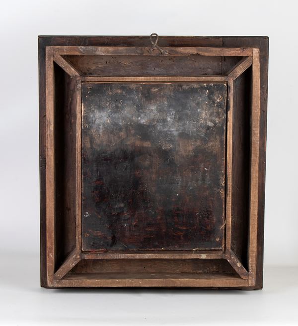 In Italian art production, especially in the central and southern regions, between the 17th and 18th centuries, there was a strong emphasis on highly detailed naturalism, influenced by Baroque style. For this reason, the details were often created with additional materials: for example, in this depiction, the eyes are made of glass, while the beard and hair are crafted from silk, and the garments are enriched with real fabrics. Furthermore, the figures were often preserved in carved wooden cases or tabernacles with glass, serving both as protection and as a means of enhancing their aesthetic value.