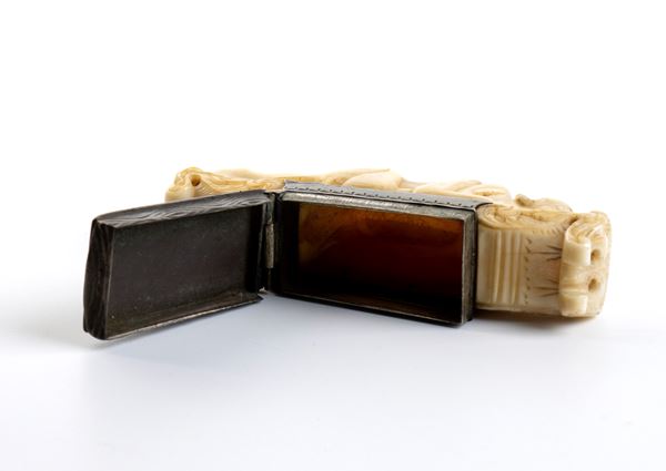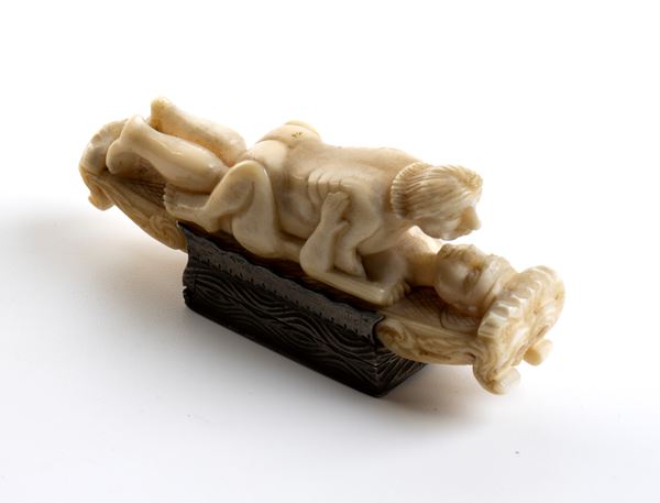 marine ivory carving (Physeter Linnaeus, 1758 or Orcinus orca, Linnaeus, 1758) depicting a male and a female figure in erotic positions. The sculpture is placed on a rectangular openable silver base.