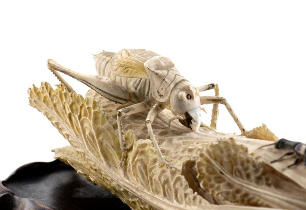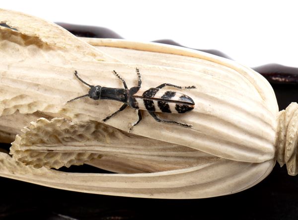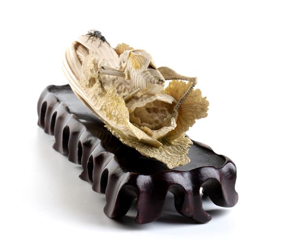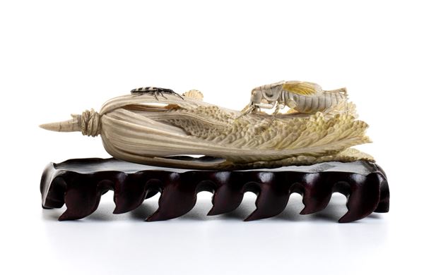 carved marine ivory (Physeter Linnaeus, 1758 or Orcinus orca, Linnaeus, 1758) depicting a Chinese cabbage with a cricket and a grasshopper placed on top of it. Rosewood base (Dalbergia spp).