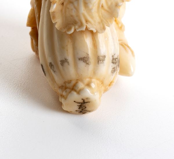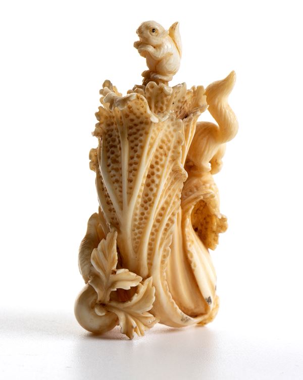 carved marine ivory (Physeter Linnaeus, 1758 or Orcinus orca, Linnaeus, 1758) depicting a Chinese cabbage with three squirrels placed on top of it.
