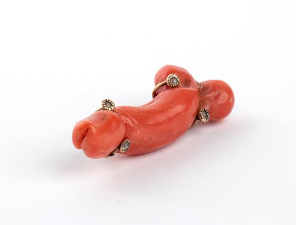 Red Mediterranean coral (Corallum Rubrum) carved in the shape of a phallus, with a steel setting.